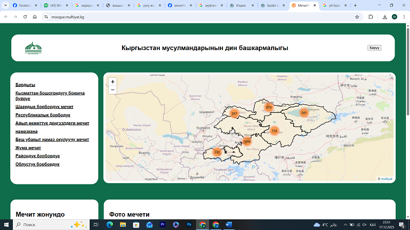 Мечиттерди каттоо, бирдиктүү онлайн реестр түзүү, мечиттердин бирдиктүү архитектуралык проектерин иштеп чыгуу иштери жолго коюлду. Анын алкагында мечиттердин карталары түзүлүп, муфтияттын расмий баракчасында колдонууга берилди.